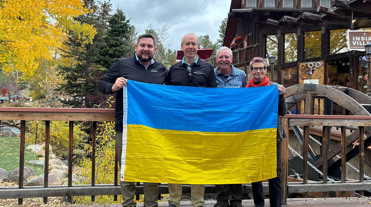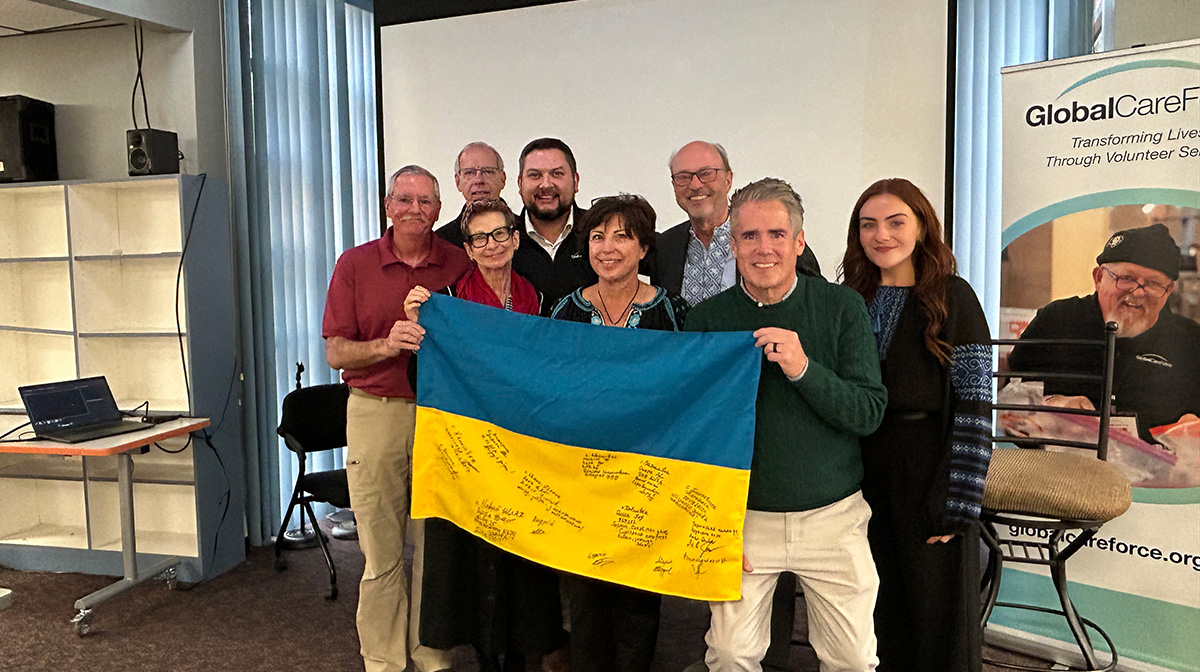 The second event, hosted by the Ukrainians of Colorado, brought together voices united in support of Ukraine, including board member Mark Dillen and Global Care Force’s Dr. Lev Prystupiuk and volunteers Bob Downs and Leanna Stoufer. During the event, Global Care Force presented Marina Dubrova, Board President of Ukrainians of Colorado, with a Ukrainian flag signed by patients served by volunteers, an emblem of gratitude and shared commitment.